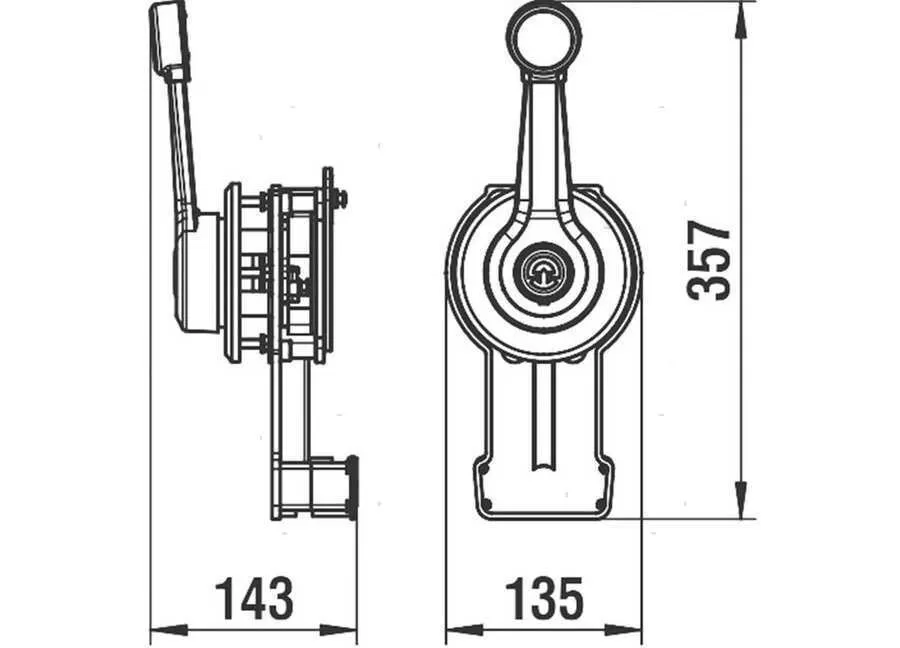 Χειριστήριο για μια μηχανή, για πλευρική τοποθέτηση, ελέγχει ρεβέρσα και γκάζι. Φτιαγμένο από πλαστικό ISEF, εξαιρετικά ανθεκτικό στην φθορά και στις καιρικές συνθήκες. Όλα τα εξαρτήματα είναι ανοξείδωτα. Διαθέτει ασφάλεια στη θέση ‘Ν’(neutral). Δυνατότητα μεμονωμένης λειτουργίας γκαζιού για ζέσταμα μηχανής. Συνδέεται με ντίζες C2, C8, C14 και C5.